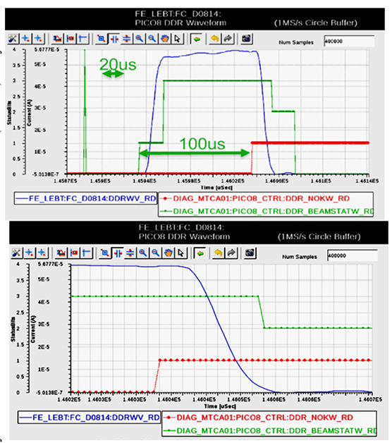 The red line goes from zero to 1. This means there is a fault, which causes the green line to go to 2 – the beam is stopping. The green line then goes to 0 – the beam is off.