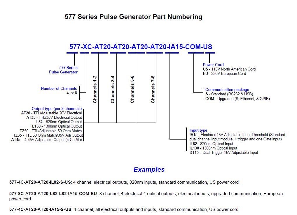 Berkeley Nucleonics’ 500 series Delay Generators offer industry-leading precision in a multitude of user-friendly form factors. Our Model 577 offers, 4, or 8 independent outputs that are designed to provide cutting-edge and cost-effective solutions. Our DDG’s generate and synchronize multiple pulses for a wide range of applications, and offer a host of optical/electrical input and output options. The delay and pulse width for each channels are independent and digitally controlled which makes the instrument ideal for situations that require synchronizing several different events. Here is the 577 Series Pulse Generator Part Numbering for your reference.