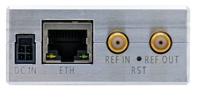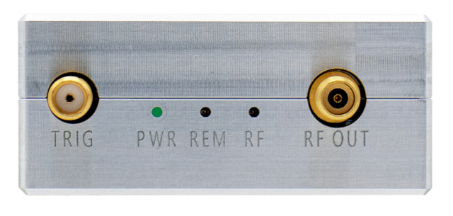 The synthesizer is a compact, flange-mountable, well-shielded module that weighs about 1.3 lb [ <0.6 kg ], measures 6.5 x 2.4 x 1 [165 x 60 x 26 mm], and consumes about 20 W of power. It cools itself passively. It has an Ethernet connection connector for connecting to a PC and can be controlled via graphical software or SCPI instructions.