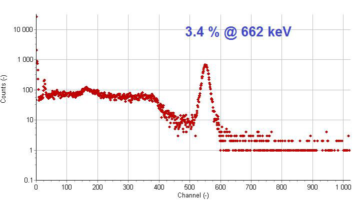 SrI2(Eu) crystals are extremely bright and feature excellent proportionality. The material performs very well at both high and low energies. Typical energy resolutions are 3.5% FWHM for 662 keV and 6% FWHM for 122 keV. Srl2(Eu) is also quite radiopure. Due to its intrinsic self-absorption, the crystal requires special surface preparations techniques. Its long decay time requires long digital shaping time constants (>10 us) which can complicate high count rate behavior. The self-absorption limits the maximum size of the crystal to approximately 4 cm.